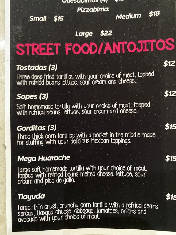 Large, thin crust, crunchy corn tortilla with a refried beans spread, oaxaca cheese, cabbage, tomatoes, onions and avocado with your choice of meat.