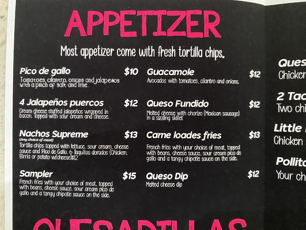 One quesadilla with your choice of meat, 3 taquitos dorados, carne loaded fries and your choice of guacamole or pico de gallo.